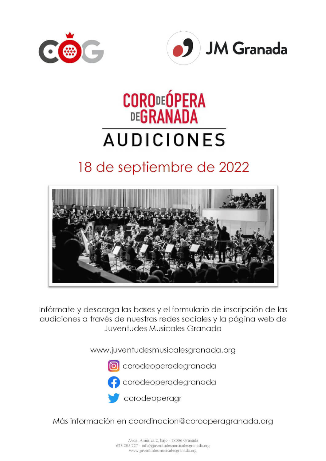 Empieza la nueva temporada de conciertos y el Coro de Ópera de Granada convoca audiciones para las voces de soprano, mezzosoprano, contralto, contratenor, tenor, barítono y bajo. La próxima temporada comprenderá los proyectos de una ópera representada, una ópera en versión concierto y un concierto lírico-sinfónico.